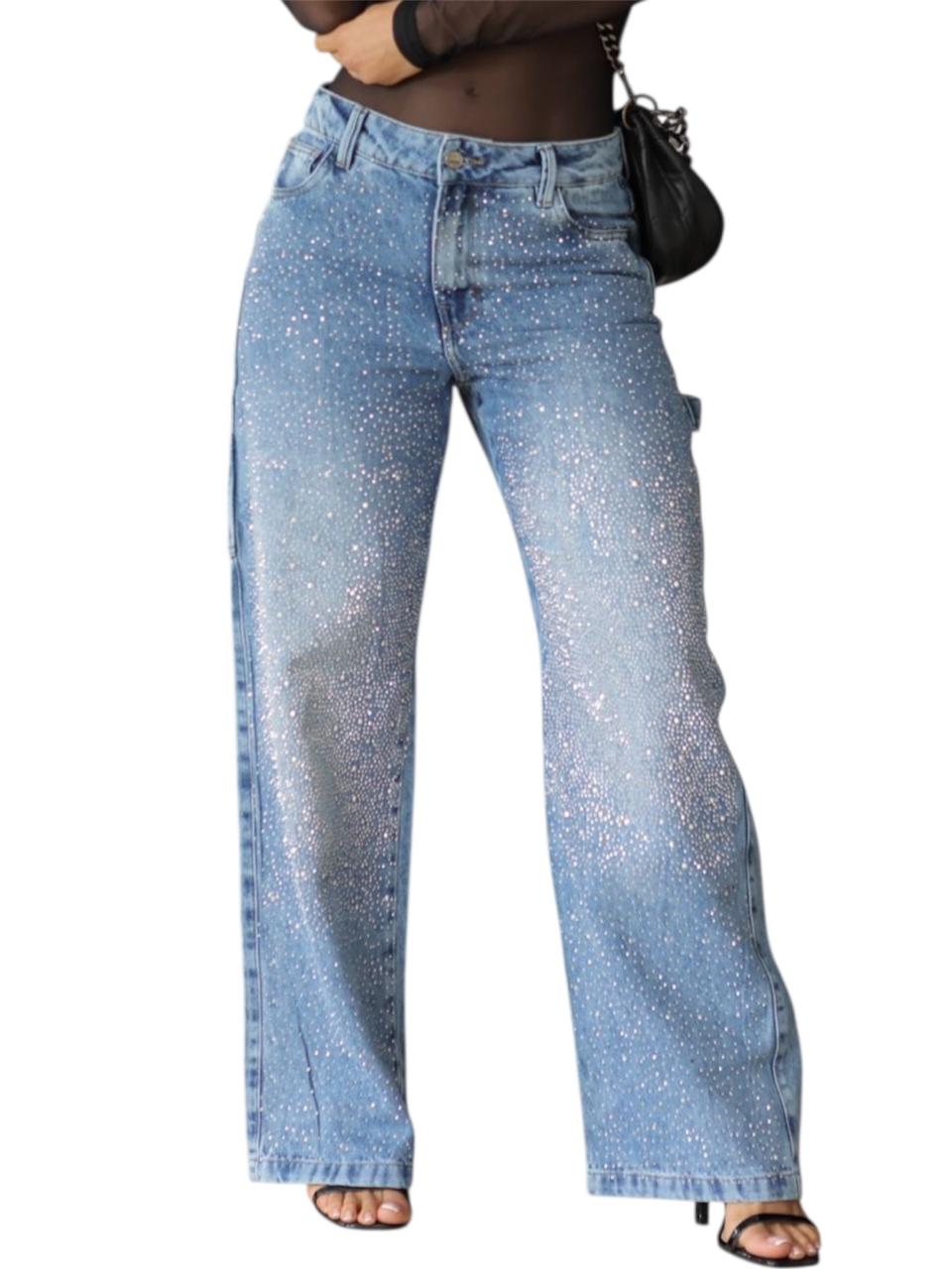 JEAN ANCHO PIEDRAS Diseñado para quienes buscan comodidad y estilo sin compromisos. Este jean de corte ancho presenta un acabado con piedras que le da un toque distintivo y moderno. Perfecto para crear looks casuales versátiles que funcionan tanto en el día como en la noche. La tela de calidad garantiza durabilidad y una caída impecable. Un básico reinventado que se adapta a cualquier ocasión.
