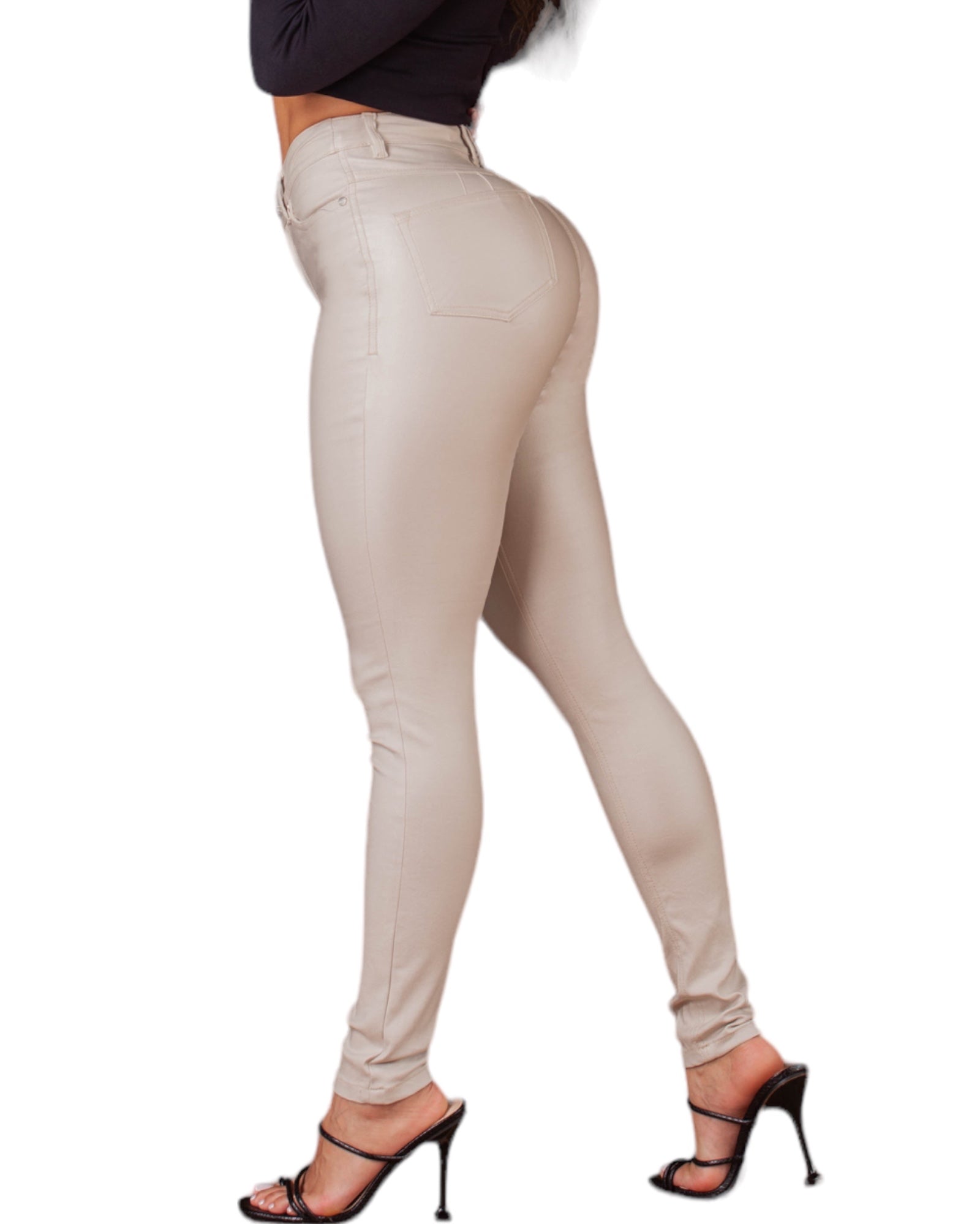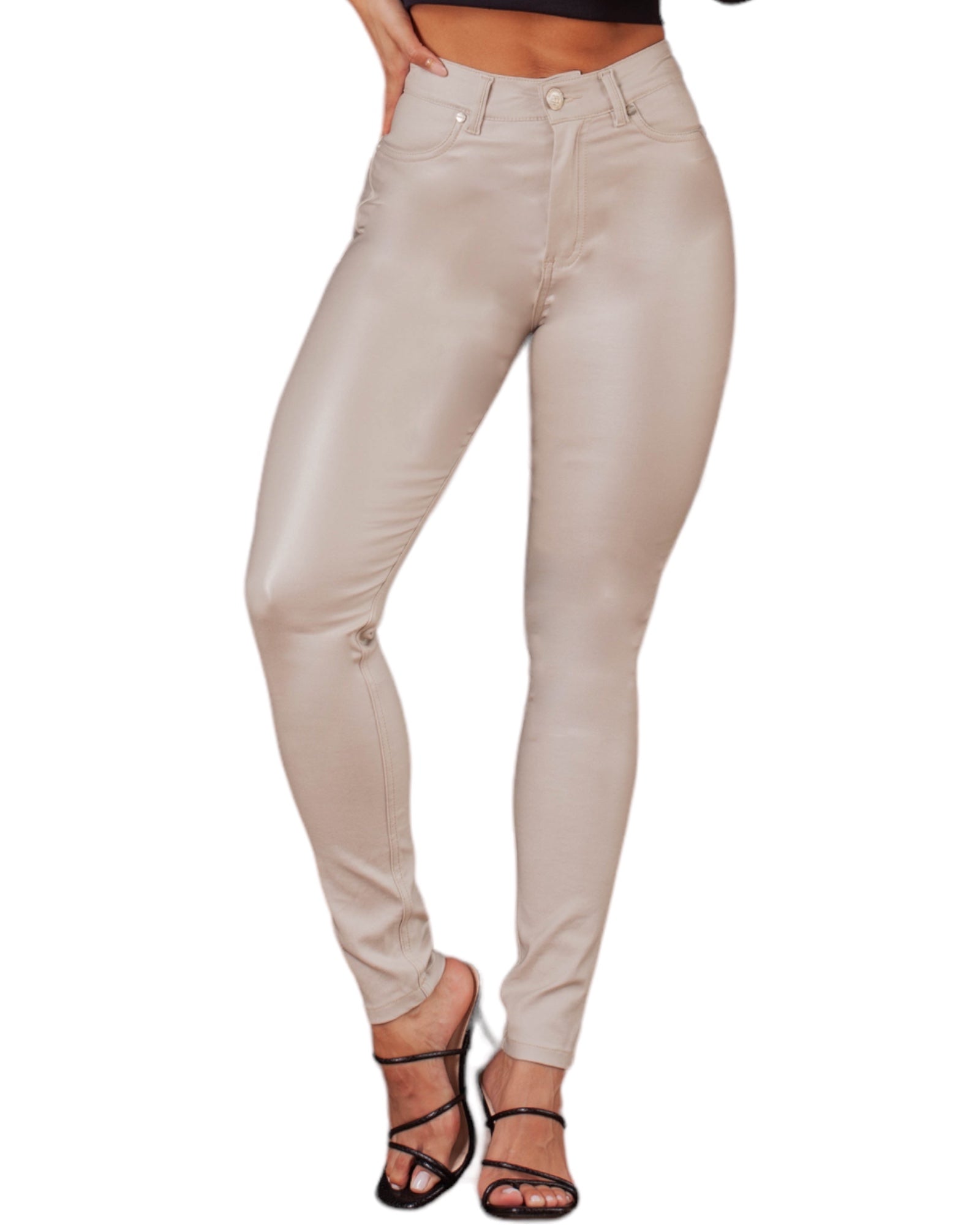 Los jeans "Tiro Alto Efecto Cuero" ofrecen un look sofisticado sin sacrificar la comodidad. Están hechos con tipo cuero de calidad, con tiro alto para una óptima colocación y máximo confort. Disfruta la moda sin preocupaciones con estos jeans modernos.